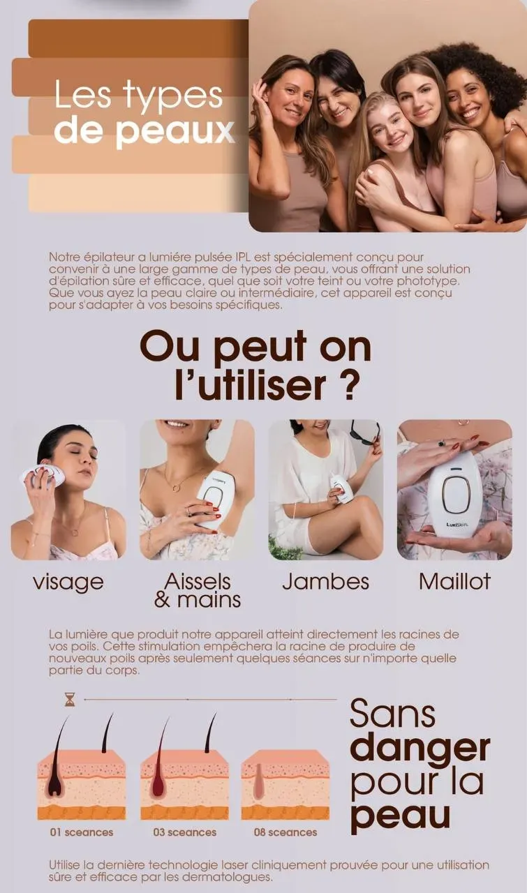 جهاز إزالة الشعر بالليزر LUXISKIN 1. يخلصك من مشاكل الشعر الزائد. 2. يعالج شعر الوجه وتحت الأذن. 3. يزيل الشعر تحت الجلد (جلد الدجاجة). 4. فعال في المنطقة الحساسة. 5. ينظف الذراعين والساقين وكل أجزاء الجسم بأمان بفضل تكنولوجيا IPL. 6. يشمل نظارات، شاحن، وكتاب استخدام لسهولة التشغيل. 7. آمن على البشرة، يحول الطاقة لطول موجي محدد يركز على بصيلات الشعر. 8. يحتوي على خاصية تبريد ليمنع الحروق. 9. مناسب للوجه والمناطق الحساسة. تخلصي من الشعر غير المرغوب فيه في المنزل ودون الحاجة للعيادات. احصلي على نتائج 100% خلال 4-5 جلسات وبدون ألم .